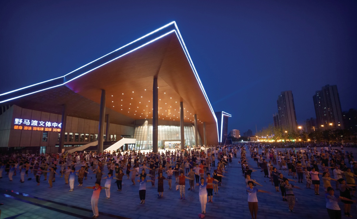 周市镇野马渡文体中心灯光璀璨,市民在广场休闲健身