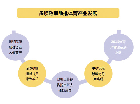 近日,中央全面深化改革领导小组审议通过中国足球改革总体方案;国务院印发《关于加快发展体育产业促进体育消费的若干意见》,提出到2025年体育产业总规模超过5万亿元的目标。分析认为,在政策利好大背景下,体育产业将有助于扩大需求、刺激消费,进而成为新的经济增长点,获得资本市场青睐。