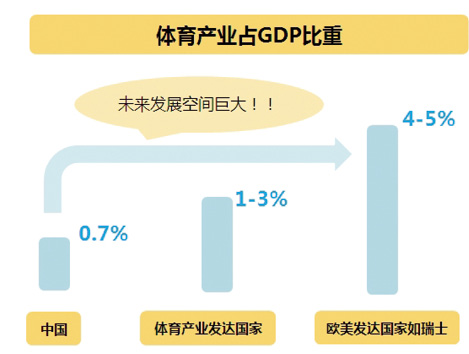 和欧美发达国家相比,中国体育产业在GDP里所占的比重非常小。发达国家体育产业占GDP比重在1%-3%之间,像瑞士这样的欧美发达国家更高,占4%到5%。可见,中国未来体育产业发展空间很大。