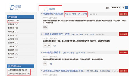 作为我国首个政府数据开放网站,“上海市政府数据服务网”(datashanghai.gov.cn)率先实现了政府数据资源向社会开放,网站部分数据已被信息服务企业调取利用,数据经济价值由政府与社会共同创造的格局已初步形成。截至2015年底,上海政府数据服务网开放了710个数据资源,内容涵盖了经济建设、资源环境、教育科技、道路交通、社会发展、公共安全、文化休闲、卫生健康、民生服务、机构团体、城市建设等11个重点领域。