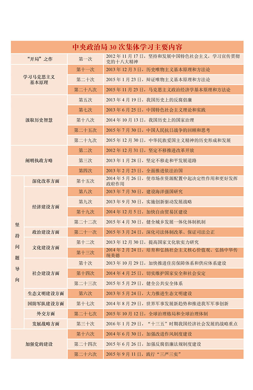 3年多的时间里,30次集体学习,既有马克思主义基本原理的学习,也有执政方略的阐释,既有对历史智慧的汲取,更有围绕重点工作的研究等,学习内容涵盖改革发展稳定、内政外交国防、治党治国治军的方方面面,展现出我党面对新情况新问题不惧挑战,坚持依靠学习走向未来的决心和信心。