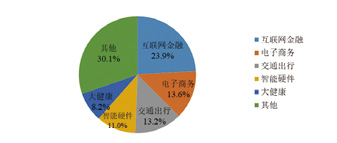近七成估值集中在互联网金融、电子商务、交通出行、智能硬件、大健康等五大领域。从企业估值来看,互联网金融、电子商务、交通出行、智能硬件及大健康的估值总计达4151.4亿美元,占总估值的69.9%。其中,互联网金融的独角兽企业估值占总估值的23.9%;电子商务行业的独角兽企业估值占总估值的13.6%;交通出行的独角兽企业估值占总估值的13.2%;智能硬件的独角兽企业估值占总估值的11.0%;大健康的独角兽企业估值占总估值的8.2%;其他类估值占总估值的30.1%。