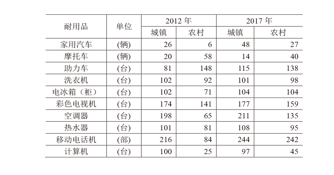 耐用品消费量升质提。耐用品消费量的提升是消费升级的直接体现。一是汽车进入快速增长期。2017年底,江苏居民家用汽车每百户拥有量达40辆,比2012年已经实现翻番。其中,城镇居民48辆,比2012年增加22辆;农村居民27辆,增加21辆。2017年,全省汽车类商品实现零售额3940.2亿元,比2012年增长58%,年均增速为12.2%,运动型多用途乘用车和环保型新能源汽车销售高速增长。二是与生活舒适度、便利度密切相关的耐用品保有量稳步提升。2017年,全省城镇居民每百户家庭拥有电冰箱、彩色电视机、空调器、热水器、移动电话机比2012年增加2台、3台、13台、7台、28部,农村居民增加33台、18台、70台、14台、158部。