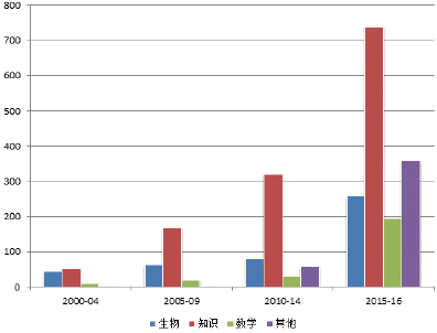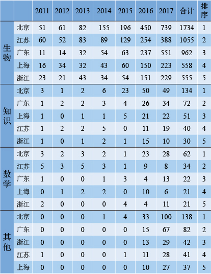 从利用中国国家专利局的数据统计得到的四类技术细分领域的发明专利申请状况看(2018年3月为止的公开专利),我国所有类型的专利申请数都从2016年开始大幅度增长,并且主要集中在和神经网络相关的“生物”技术类。北京、江苏、广东、上海、浙江的申请数量在四类中均为全国前5位。其中北京在所有技术细分类别中都名列第一,江苏在“生物”和“数学”技术领域的申请数为全国第二,在“知识”和“其他”领域为第四位。