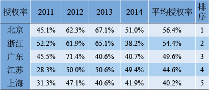 专利的授权是衡量专利质量的一个重要指标,由于从申请专利到授权有时间滞后,鉴于“生物”以外的其他三类专利申请大多从2016年开始,已授权专利数量过少,所以本文只选取“生物”进行授权率的统计分析。如表4所示,2011至2014年在与神经网络相关的“生物”细分领域,江苏的平均授权率是44.6%,和第一位的北京56.4%有较大差距,并次于浙江和广东,位于全国第四,表明江苏的专利质量有较大的改善空间。