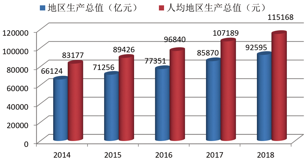 紧紧扭住发展第一要务,推动经济稳定健康发展,经济实力大幅跃升,经济总量跨上新台阶,主要经济指标都占全国1/10以上。2014年到2018年,全省生产总值累计增长32.9倍,年均增长7.6%20152017年分别突破6万亿元和7万亿元,2018年超过9万亿元,列各省(区、市)第2位。2018年,全省人均生产总值11.5万元,按汇率折算为1.74万美元,居各省区首位。按照世行标准,江苏人均国民收入超过中等偏上收入国家和地区水平。全社会劳动生产率由2014年的人均13.9万元增加至2018年的19.5万元。