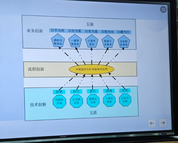 同时建立“五服”支撑,以情报AI服务为基础,实现多维度攻击态势可视化;以一键修复服务为保障,实现自动化补丁管理;以 AI智库服务为支撑,基于128B样本生成应急方案;以数据安全服务为后盾,依托HDFS集群确保秒级恢复;以动态联防服务为驱动,建立整体防御体系。
